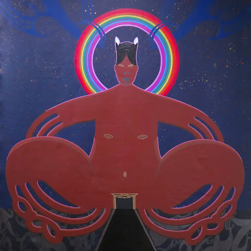I even included the kaitā who gave me my moko kauae, Ngaire Tuhua. Her painting in this exhibition is called Tatau o te ora, a grand portrait of Hinenui, drawn as an archetype of creation and connection. Her form dominates the space, unapologetically full and commanding, grounded in the undeniable presence of her kōpū — a vessel of life, memory and generational strength. A rainbow surrounds her head like a halo, guiding us to see Hinenui as a mediator of both light and darkness.