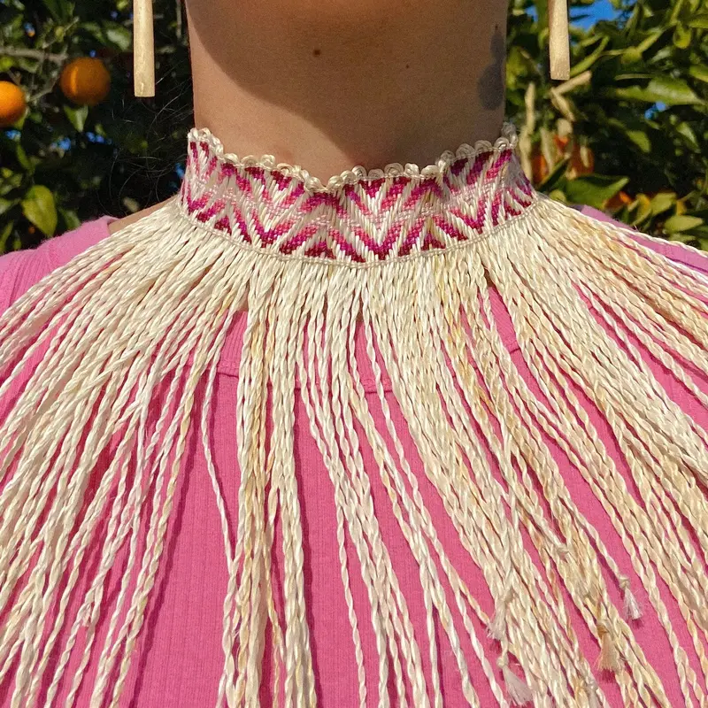My students, whose growth in toi Māori fills me with so much pride. Some of my own mahi was in the exhibition, too. I displayed my first attempt at tāniko, in a bright-pink sunset intertwined with the natural glow of muka. I wore this tāniko piece around my neck as I lay on the table to receive my moko kauae.