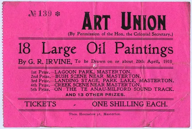 New Zealand artists began running art unions from the 1860s. People would buy a chance to win a work of art, and ticket sales allowed for fundraising. In the following decades lotteries became a popular way to raise funds for civic infrastructure, sporting facilities, and cultural initiatives. They often borrowed the art union name as a euphemism, even as prizes shifted towards gold nuggets, cash, houses, cars, boats and animals.